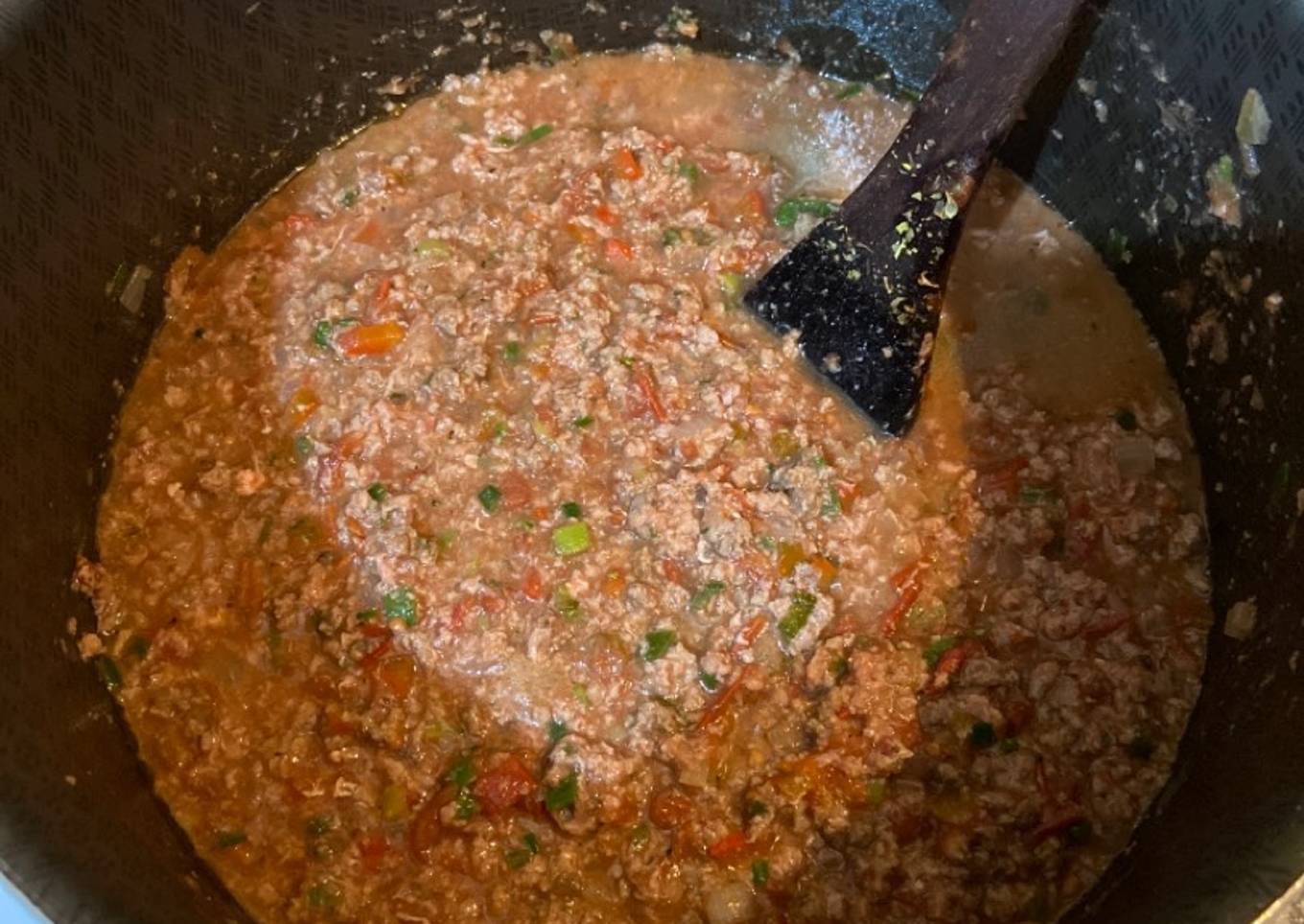 - Incorporamos la carne picada, manteniendo a fuego moderado incorporando todo y agregando 100 ml de agua limpia