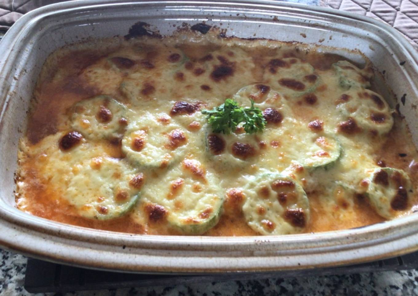 - En un poco de leche disuelva la maicena, el resto caliente hasta hervir, vierta la maicena en la leche caliente y cocine removiendo 1 o 2 minutos hasta que espese, sazoné con sal y pimienta. Aparte del fuego y eche el queso y la yema, mezcle bien. Encima de la carne coloque las ruedas de tomate, luego el calabacín, cubra con la salsa blanca y el queso parmesano, horneé en un horno precalentado a 375º F/ 190º C por 25 o 30 minutos o hasta que se vea dorado.