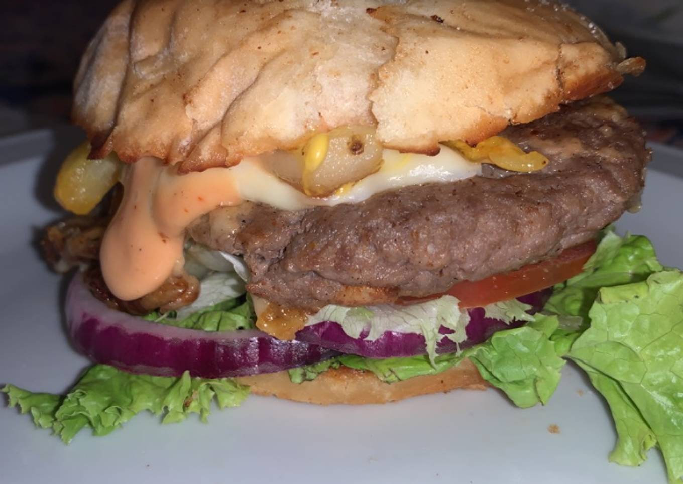 - Cuando la carne está al gusto deseado, solo queda armar la hamburguesa, untando el pan con la salsa especial, colocando en este orden: lechuga, cebolla morada, tomate, la hamburguesa y por último el queso mozzarella por arriba. Cerrar con el pan untado en abundante salsa especial. Ideal acompañarla con papas fritas!! Saludos y espero que las hagan, son mortales!!