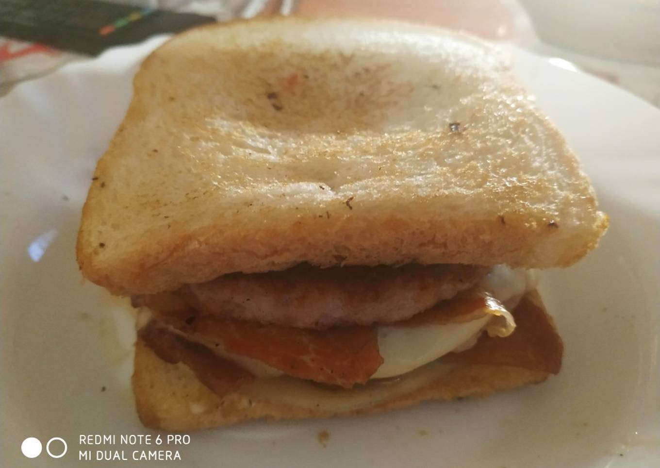 - Cuando tengamos las hamburguesas, una de ellas la colocamos encima de la cebolla, el jamón y el queso. Encima de la hamburguesa ponemos la otra loncha de queso, y las otras dos lonchas de jamón fritas. Y colocamos la otra hamburguesa encima con la otra rebanada de pan. Lo metemos un minuto al microondas para que se caliente un poco el queso y listo.