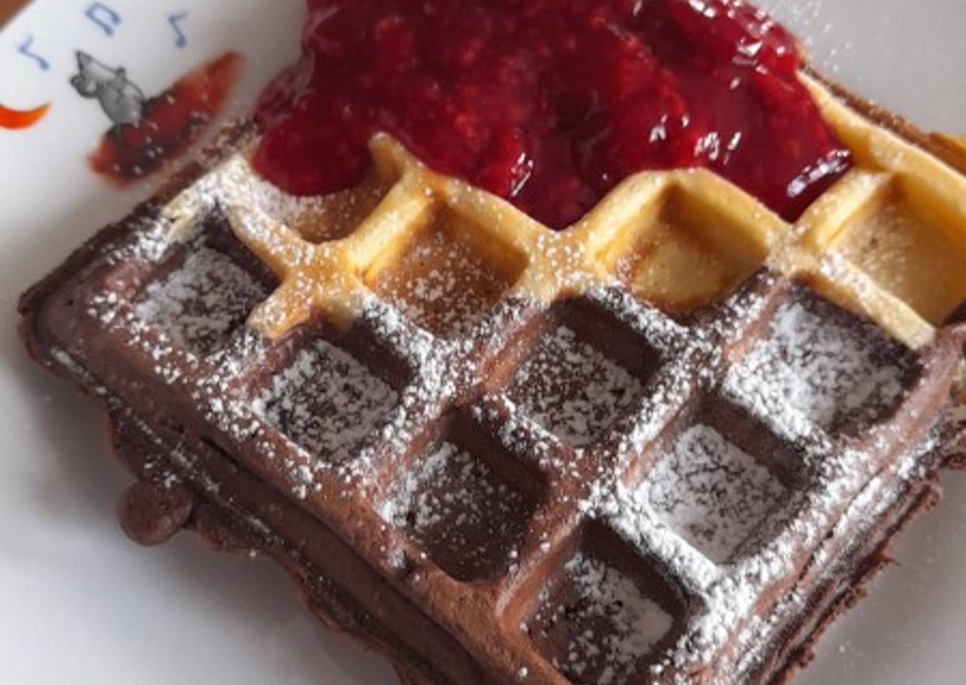Waffles bicolor con salsa de frambuesas